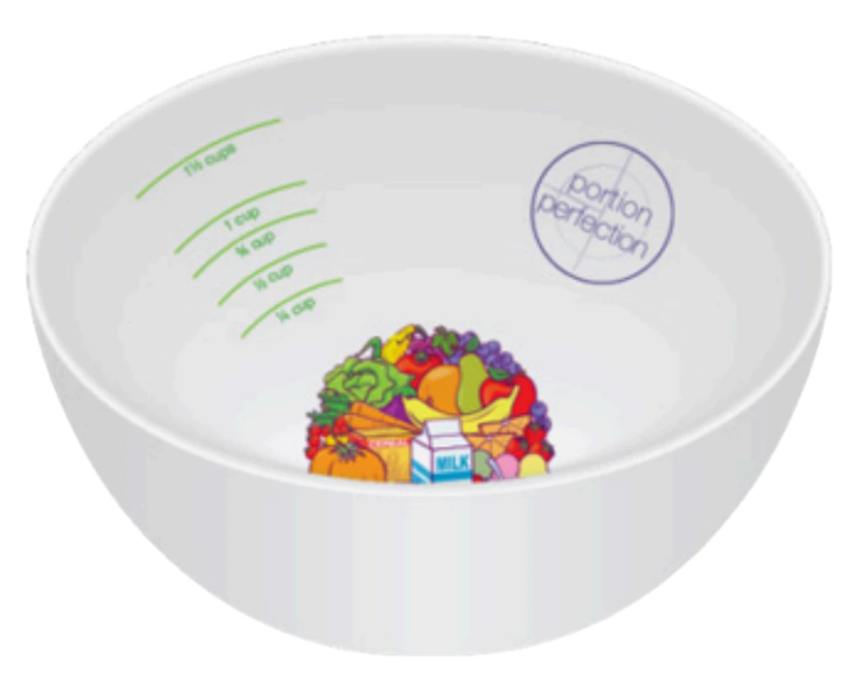 The Portion Perfection bowl shows cup measures on the inside so you can pour foods such as cereals straight into the bowl without weighing or measuring first. The bowl works best with dietary advice on the best portion sizing for you. The 1 cup measurement on the Portion Perfection bowl is based on the volume of 250g of water. A standard 1 cup measurement differs from country to country; the Portion Perfection Bowl uses this scientific measurement to ensure accuracy.